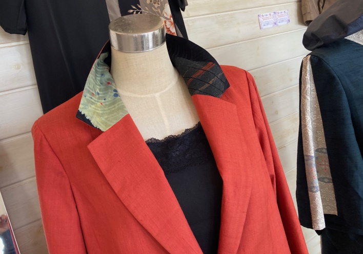 ↑ ジャケット 襟の柄合わせは着物をリメイクしたものならでは。