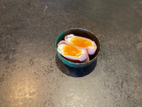 ハムの上に卵を割り入れたら、塩こしょうを軽く振る。